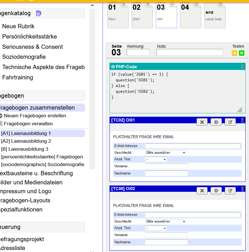 PS: Die beiden Opt-In-Fragen sind identisch, beide verweisen auf Serienmail "1", die verweist wiederum auf Fragebogen A2. Der einzige Unterschied ist in der Teilgruppe, KG und EG.