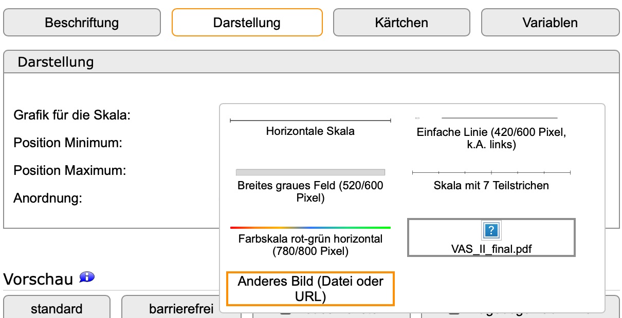 ich nutze bei dem Fragetyp "Karten anordnen (eindimensional)" die Funktion, eine eigene Skala als Grafik (hier PNG) einzufügen.