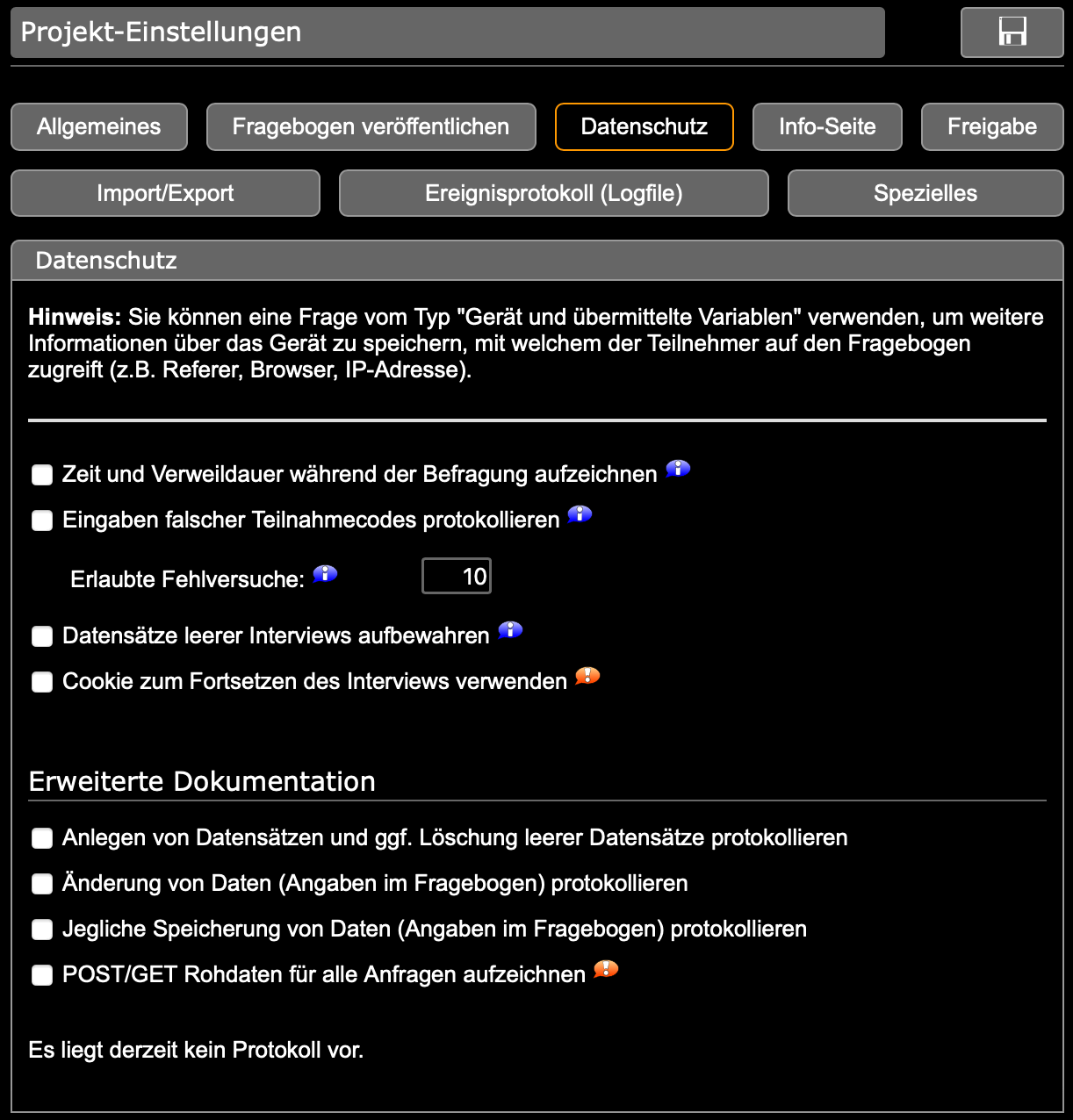 Bei mir wird aber keinen "Online AVV" unter Datenschutz angezeigt, sondern nur die Erweiterten Funktionen und darunter "Es liegt derzeit kein Protokoll vor" (siehe Bild). Ich arbeite über einen Hochschulaccount auf dem normalen SoSciSurvey-Server. Wie kann ich das Problem beheben? Ich habe ein anderes Online Formular gefunden auf dem man online einen AVV beantragen kann aber wenn ich angebe, dass ich auf dem SoSciSurvey-Server arbeite wird gesagt, dass ich dafür nur einen AVV innerhalb meines Fragebogens unter den Proeinstellungen unterschreiben kann. oder auf den s2survey-Server umstellen soll.