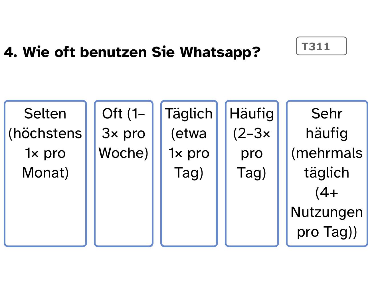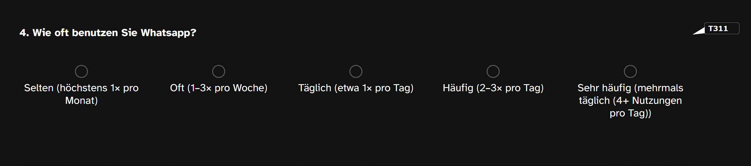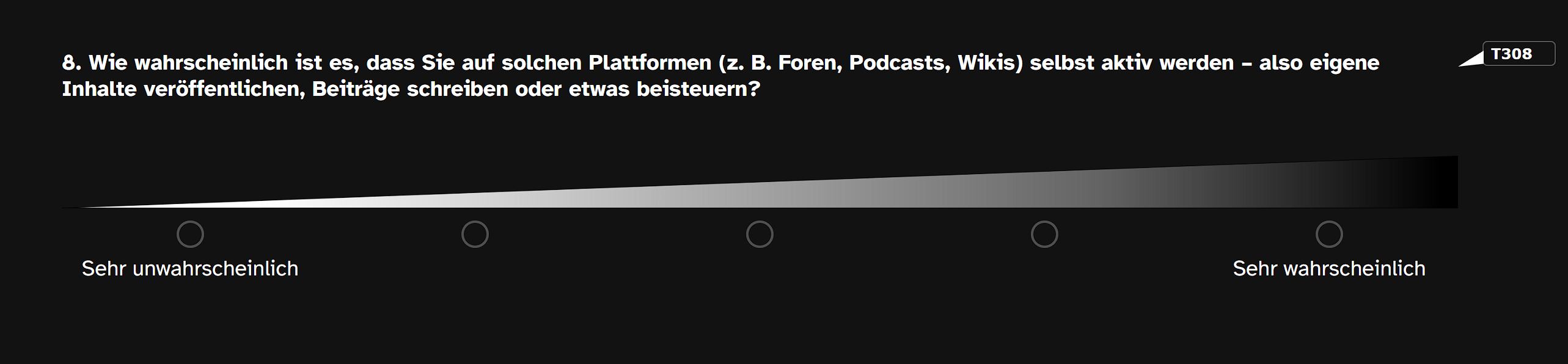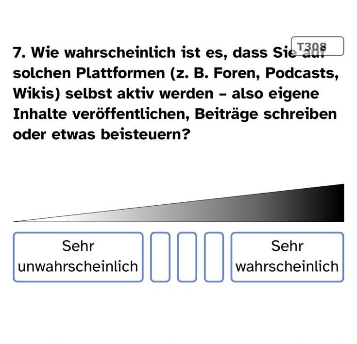 Kontrollieren Sie auch, welche Fragetyp Sie verwenden. Die "Skala (mit Zwischenwerten)" ist für eine Skala ohne Zwischenwerte nicht optimal geeignet, da wäre die "Skala (Extrema beschriftet)" die bessere Wahl. Und die horizontale Auswahl (ich würde jetzt raten, dass Sie diese bei T308 verwendet haben) verhält sich nochmal ein wenig anders.