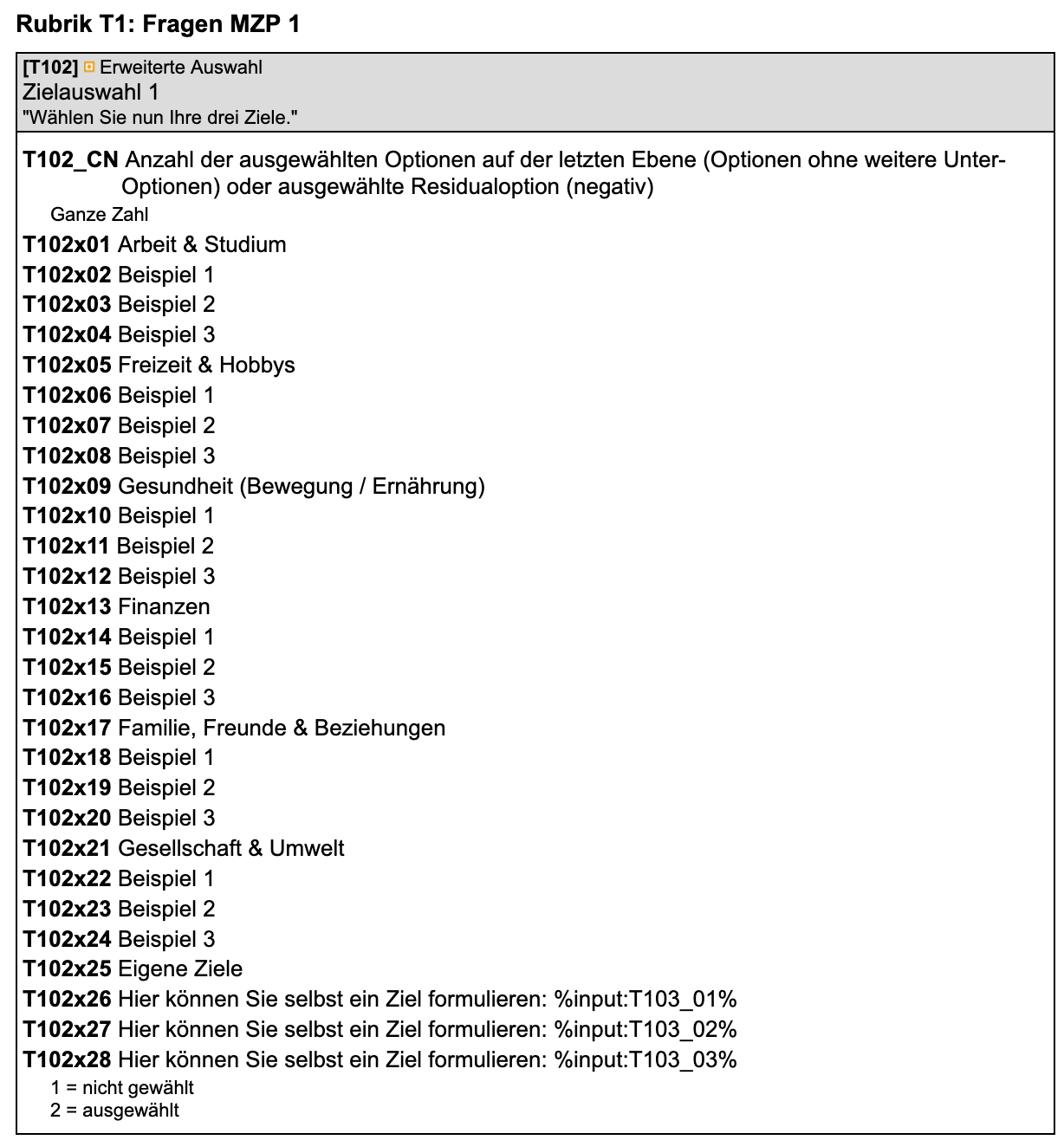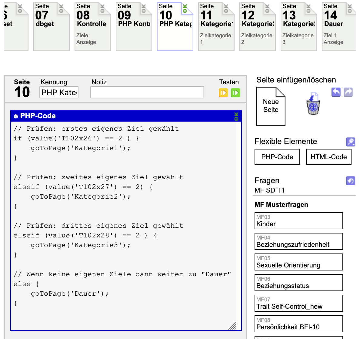 Der Code funktioniert bisher nicht, er führt einfach immer für alle drei in der Mehrfachauswahl gewählten Variablen über die Seiten "Kategorie1", "Kategorie2" und "Kategorie3". Also auch dann, wenn nicht die freien Textfelder (x26, x27, x28) gewählt wurden.