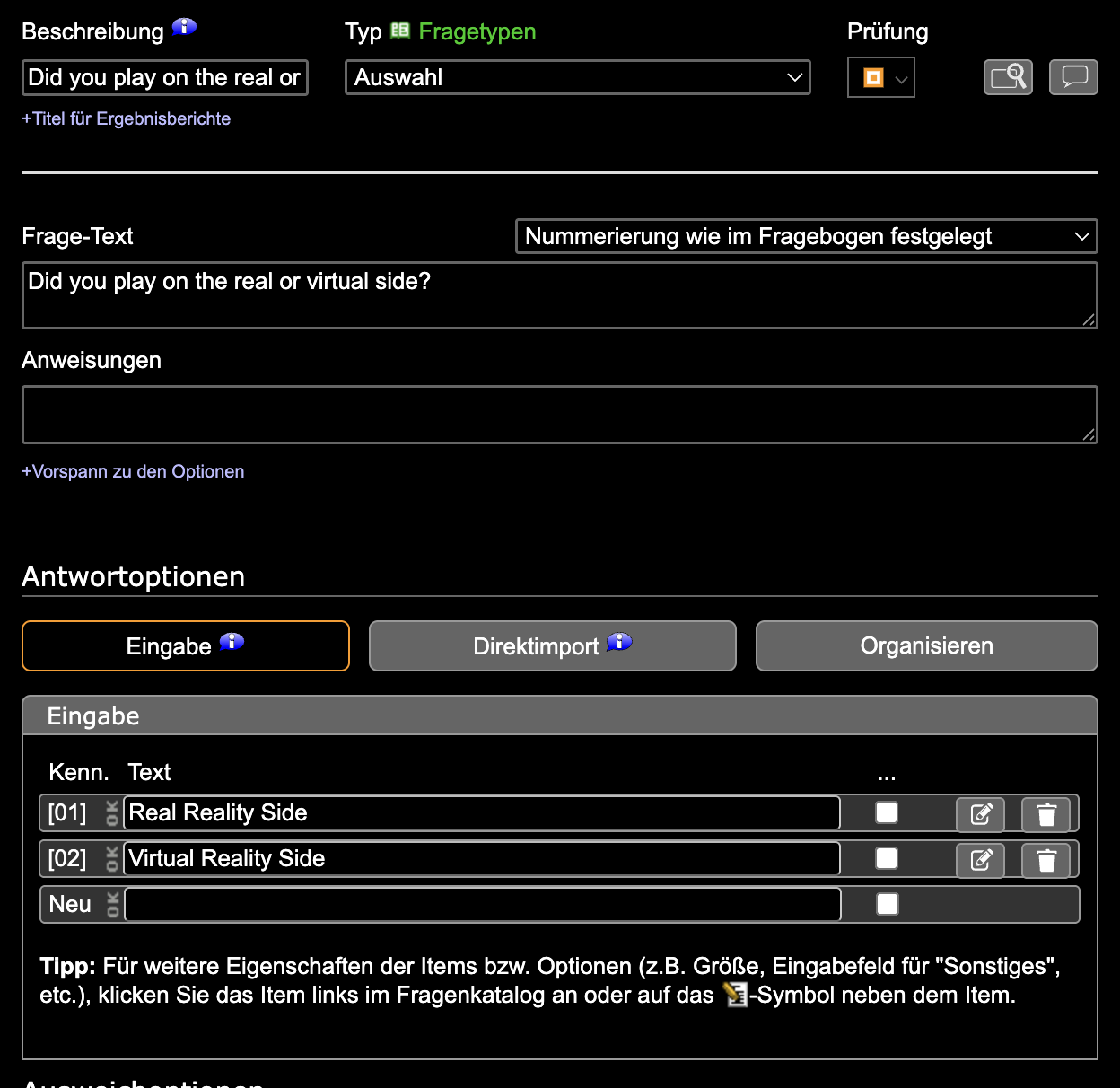 Wenn Sie damit nicht fündig werden, dann starten Sie den Fragebogen bitte im Debug-Modus und prüfen Sie, was nach dem Klick auf "Weiter" in der Debug-Information rechts oben angezeigt wird.