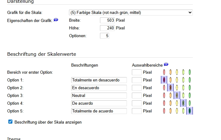 Ich bin dabei eine Umfrage mit einer Bild-Skala zu erstellen. Leider passen die Wörter nicht drauf. Wenn ich die Breite ändere, sind die Optionen nicht mehr zentriert. Wenn man das nicht macht, sind sie aber ge-cropped. Oder ich muss halt Bindestriche machen, aber das ist suboptimal. Bei normalen Likert-Skalen kriegt man das Problem ja easy gelöst, aber bei der Bild-Skala funktioniert das irgendwie nicht so :/