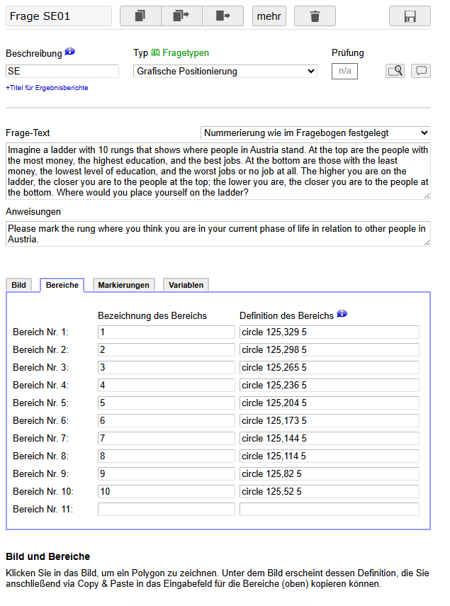 I uploaded an image (a ladder with 10 rungs) and defined one selectable area per rung (initially using polygons, later circles). Additionally, I created a marker (“diagonal cross”) so that participants should see their selection visually.