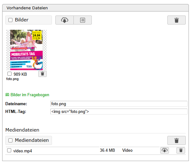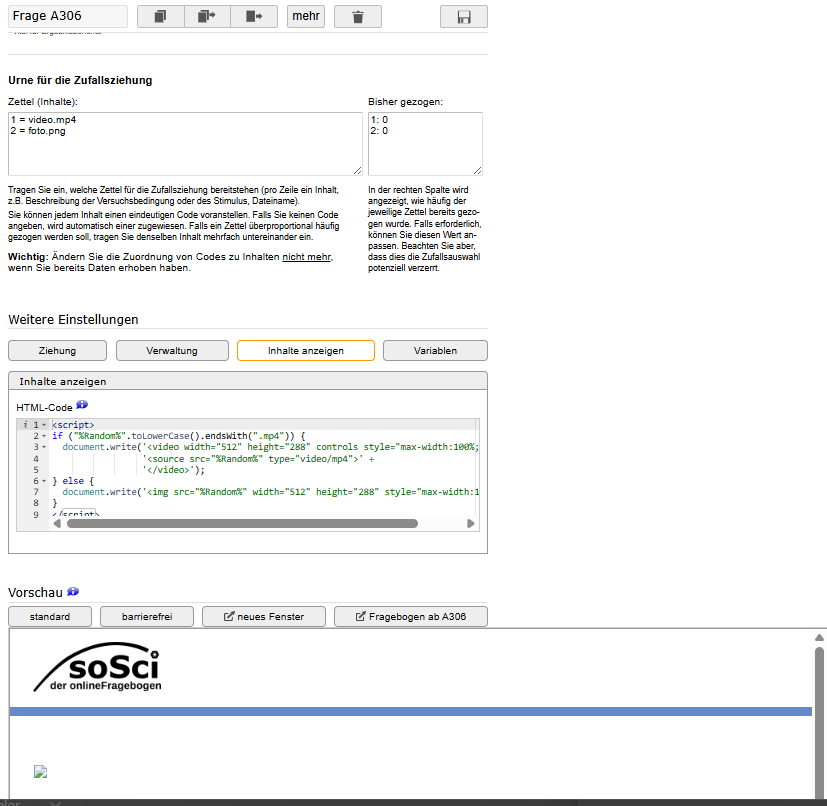 Ich würde gerne eine Randomisierung erstellen. Eine Gruppe soll ein Video sehen, die andere Gruppe ein Bild. Jedoch werden die Medien trotz hochladen nicht angezeigt. Woran liegt das? Ich habe Screenshots hochgeladen, was ich gemacht habe.