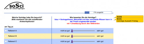 ich möchte gerne für eine Fachtagung die Evaluation für die Referenten online gestalten. Die Tagung verläuft über mehrere Tage und viele Veranstaltungen verlaufen parallel. Daher können die Teilnehmer nicht alle Referenten bewerten. Aber um den Fragebogen trotzdem übersichtlich zu gestalten möchte ich das gerne folgendermaßen gestalten: